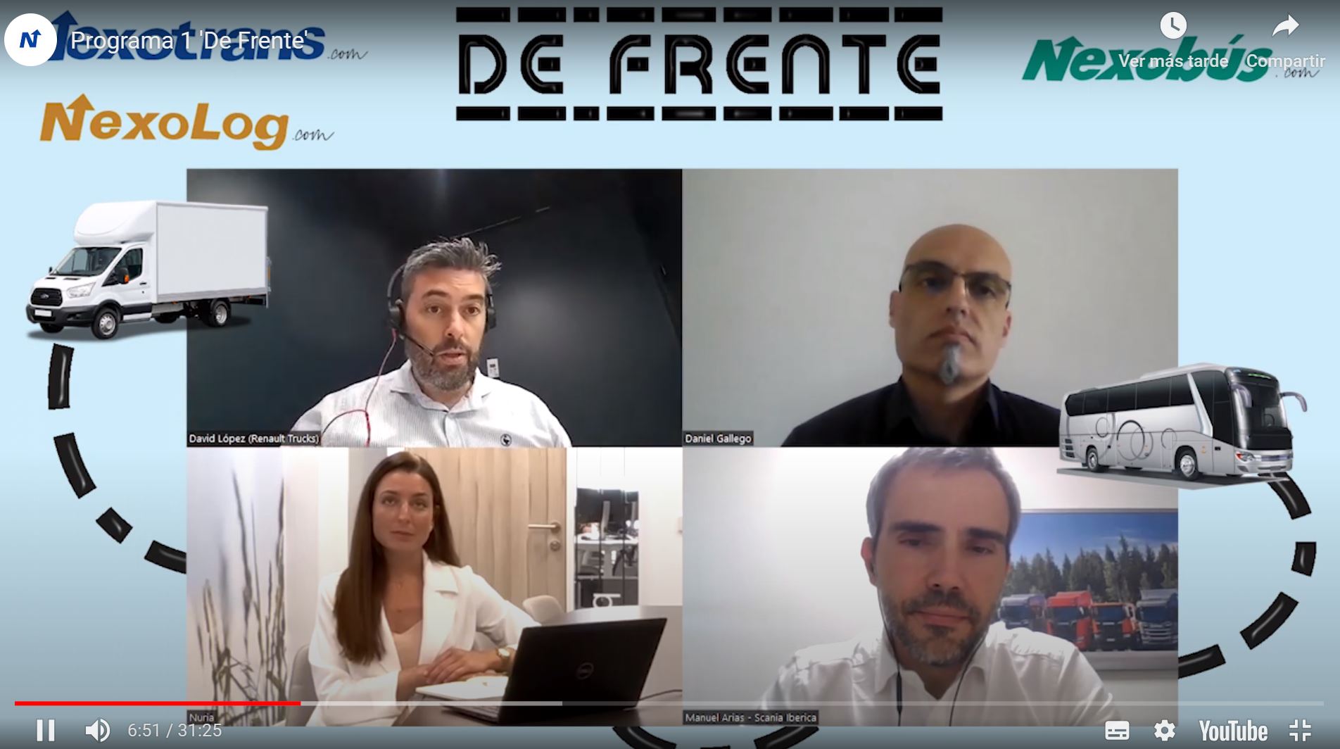 La primera entrega de De Frente versa sobre la electrificación de los camiones, y para ello contamos con tres fabricantes que apuestan claramente por ir descarbonizando su oferta de producto. David López, director de Electromovilidad en Renault Trucks España; Nuria Álvarez, directora de Electromovilidad en Volvo Trucks; y Manuel Arias, responsable de Desarrollo de Transporte Sostenible de Scania; fueron nuestros primeros invitados al debate.