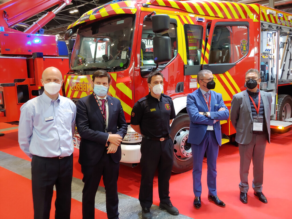 La bomba urbana pesada Renault Trucks d 2.1 280.18 R 4×2 E6 crew cab, destinada a la extinción de incendios, tanto urbanos como industriales, descansaba en el stand de Incipresa (stand 8D01), compañía encargada del carrozado y de hacerlo llegar al cuerpo de bomberos de Alcorcón, que será el usuario final. Allí, Juan Antonio Sánchez, key account sales manager de Renault Trucks España, explicó que el cliente demanda, en su gran mayoría, las transmisiones de Allison. Nosotros vendemos centenares de unidades con este equipamiento, sobre todo, según sus comentarios, por lo que aportan a la hora de acelerar y frenar. Al respecto del vehículo, Sánchez recalcó que es el primero en España con esta configuración, cabina triple para siete personas con asientos individuales con cinturón de seguridad (que podrían llegar a ser ocho) y con todo su equipamiento a bordo, concluyendo que es muy importante la personalización que podemos hacer, porque cada municipio y Cuerpo de Bomberos tiene sus necesidades. En esta ocasión, la anchura total carrozada es de 2.400 mm, algo esencial para acceder a lugares donde otros vehículos no pueden hacerlo.