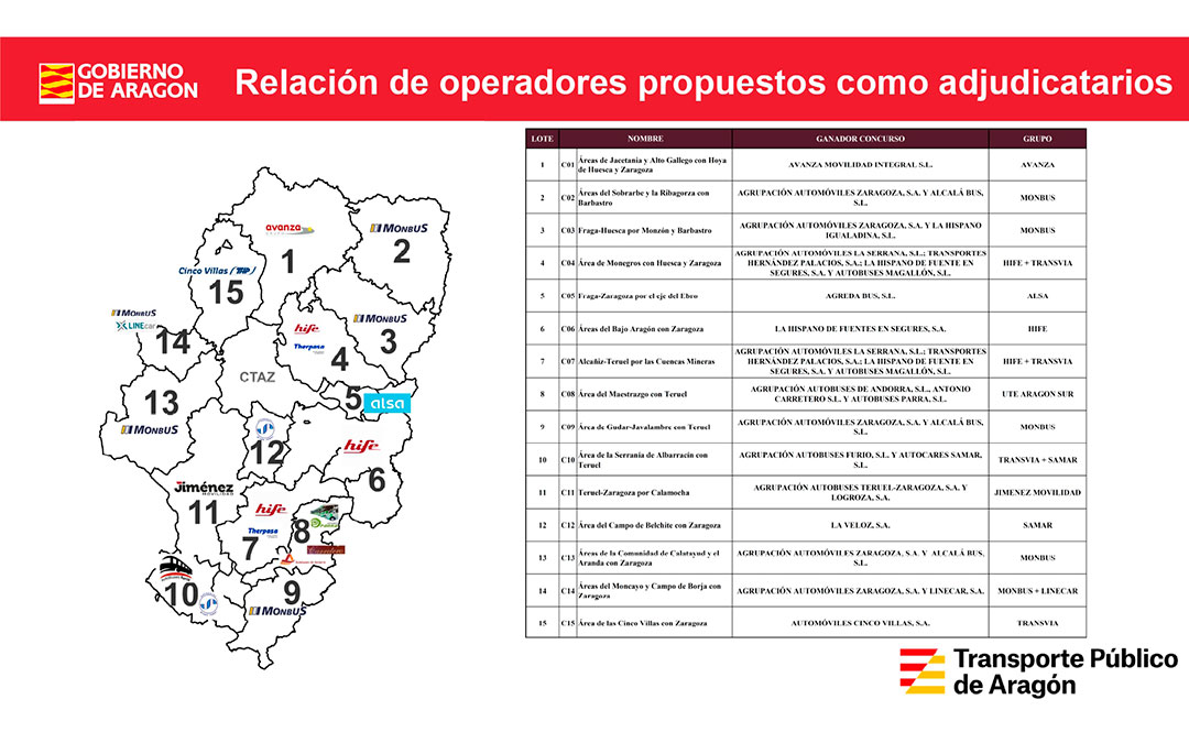 En cuanto a la propuesta de adjudicación de los 4 contratos para los servicios en el ámbito metropolitano se resolverá en las próximas semanas. Respecto al ámbito interurbano, cuya oferta se incrementa un 13%, se incorporan 403 núcleos de población al servicio con el objetivo de garantizar una conexión con la localidad en la que se encuentra el centro de salud para todos los núcleos de población, a partir de 10 habitantes, por lo menos una vez a la semana. A los 15 contratos para la prestación del servicio se presentaron un total de 35 ofertas. La baja media del conjunto de ofertas seleccionadas es del 18,58%manera que el Gobierno de Aragón garantizará el servicio con un ahorro respecto al precio de licitación 2,23 millones de euros. En definitiva, se destinarán un total de 9,8 millones de euros al pago de los servicios de transporte.