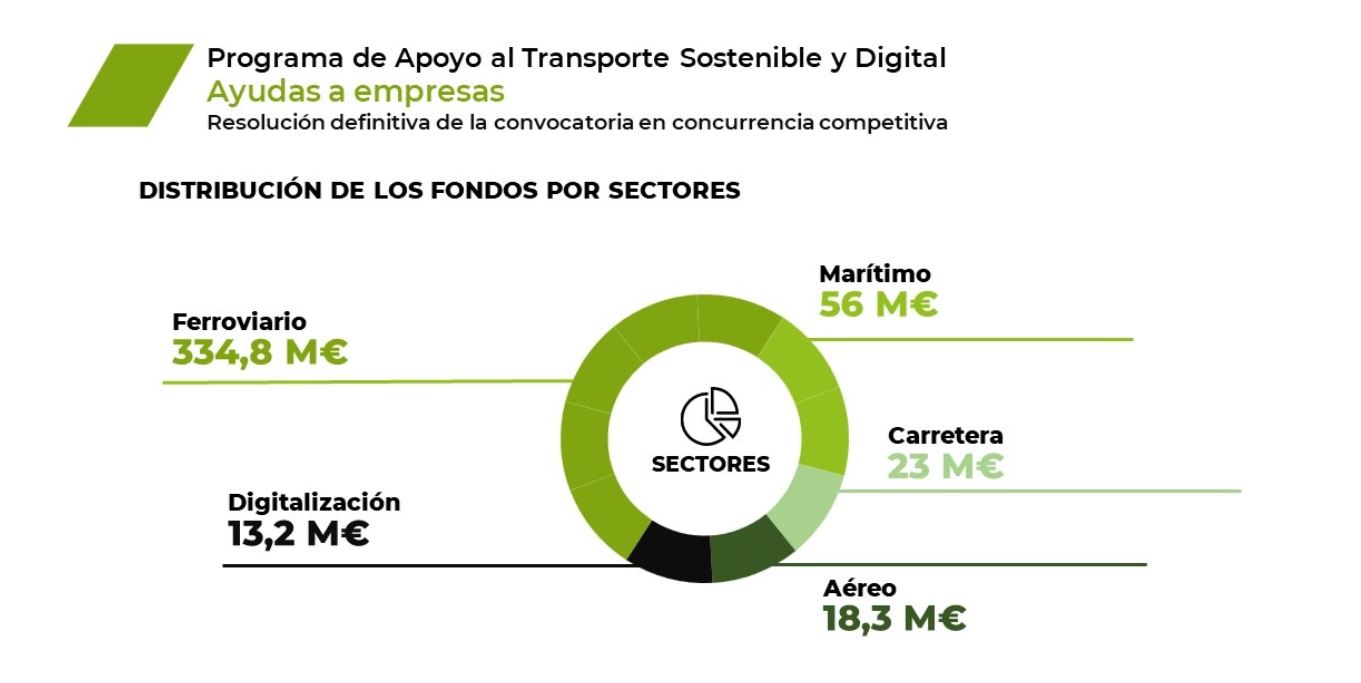 Así, el transporte ferroviario de mercancías recibirá un total de 334,8 millones; al sector marítimo se le asignan 56 millones; otros 18,3 millones de euros van al sector aéreo y, para el transporte por carretera, se destinan cerca de 23 millones de euros para financiar 19 proyectos de producción de pavimentos sostenibles, la construcción de dos aparcamientos seguros con 1.173 plazas en total y de dos hidrogeneras, y para promover cinco proyectos de implantación de Sistemas Inteligentes de Transporte (ITS) con impacto en más de 3.500 kilómetros de carreteras concesionadas. En cuanto a la digitalización de los servicios de transporte de mercancías de los sectores ferroviario y marítimo, las ayudas ascienden a 13,2 millones de euros.