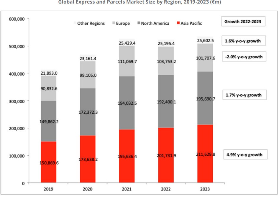 Las proyecciones provisionales muestran que “Asia-Pacífico es el mayor mercado regional de paquetería en 2023, con un valor de 211.600 millones de euros en 2023, sólo ligeramente por delante del mercado norteamericano, valorado en 195.700 millones”, quedando de nuevo en evidencia “las diferencias de crecimiento regional en las tasas de crecimiento interanual previstas para 2023. Se prevé que el mercado europeo de paquetería se contraiga un 2,0% en 2023, ya que se espera que el crecimiento económico europeo disminuya considerablemente”.