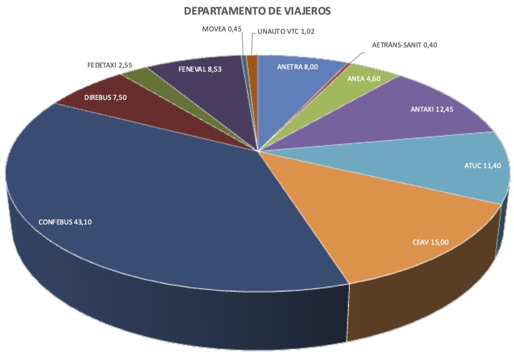 Con 43,1 votos del total de 115 en el Pleno de Viajeros, la confederación triplica a la segunda organización con más peso. Además, ostenta la totalidad de los votos en la sección de estaciones de autobuses, el 69% en el transporte público interurbano de viajeros y el 24% en el transporte público urbano.