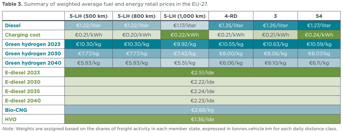 A modo de resumen, el cuadro adjunto resume los costes medios ponderados de energía y combustible de la UE-27 considerados en este análisis. El coste medio ponderado tiene en cuenta los porcentajes de la actividad de transporte de mercancías en cada Estado miembro, expresados en toneladas-vehículo/km para cada clase de distancia diaria. A cada clase de camión se le asigna una clase de distancia en función de su autonomía de conducción diaria. Los datos de la actividad de transporte de mercancías se extraen de Eurostat.