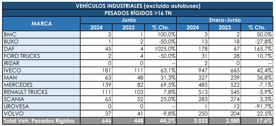 Las matriculaciones de vehículos rígidos de más de 16 toneladas registraron el pasado mes de junio un incremento del +44,2% (hasta un total de 646 unidades), según los datos aportados por Anfac y el resto de Asociaciones del Sector.