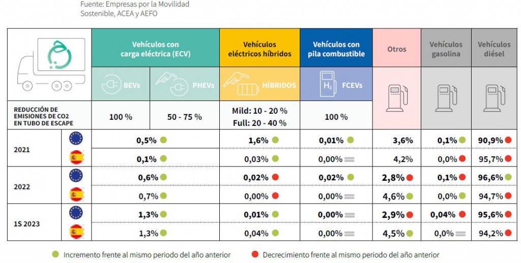 En el primer semestre de 2023, las nuevas matriculaciones de camiones en la UE registraron un aumento significativo del 20%, alcanzando 179.508 unidades, con la mayor parte de los mercados comunitarios creciendo por encima de los dos dígitos. El diésel mantuvo su dominio del mercado y representó el 95,6% de las matriculaciones de camiones nuevos, con un aumento del 19,2% de las matriculaciones. Las ventas de camiones eléctricos a batería aumentaron un 351,5%, alcanzando las 2.384 unidades. Un dato que debe explicarse, puesto que aunque apenas representa el 1,3% de la cuota de mercado, su crecimiento es casi un punto sobre lo registrado el año pasado.