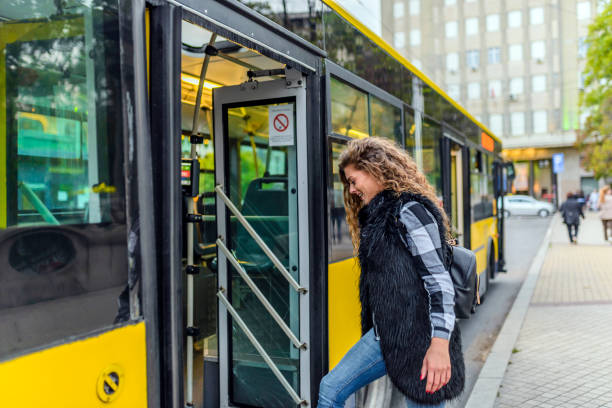 Young woman enters bus