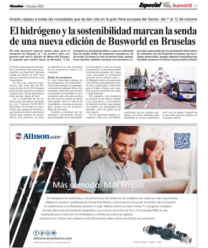 Así se desprende de las declaraciones que hemos recabado en este ‘Especial NEXOBUS Busworld’, en el todos los expositores que estarán en Bruselas y que tienen actividad comercial en nuestro país repasan sus expectativas, muy positivas, así como un adelanto de lo que mostrarán en sus respectivos stands a los visitantes.