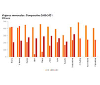 En los primeros nueve meses de 2021 el número de viajeros ha aumentado un 20,8% respecto al mismo periodo del año anterior.La tasa de variación del número de pasajeros del transporte público del mes de septiembre respecto a agosto es del 47,4%. Para contribuir al análisis e interpretación de los datos, en el siguiente gráfico se muestra la evolución de la tasa mensual del número de usuarios del transporte público en los últimos años.