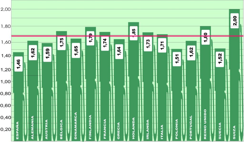 Como comentábamos, España vuelve a figurar como el país más barato, en esta ocasión por delante de Polonia (que baja dos y queda en 1,51) y Suecia (1,52, -4), con lo que estos tres vuelven a ser los integrantes del podio, como viene sucediendo durante el último mes.