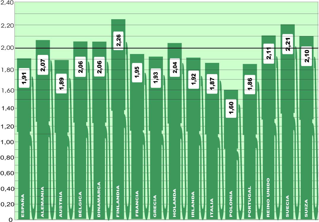 En los últimos siete días, la bajada más pronunciada se registró en Suecia, 12 céntimos, mientas que la mayor subida la experimentan los clientes italianos, con nueve céntimos. Además de Suecia, Dinamarca fue el único país a la baja (-7 céntimos), mientras que Alemania no varió su precio medio.