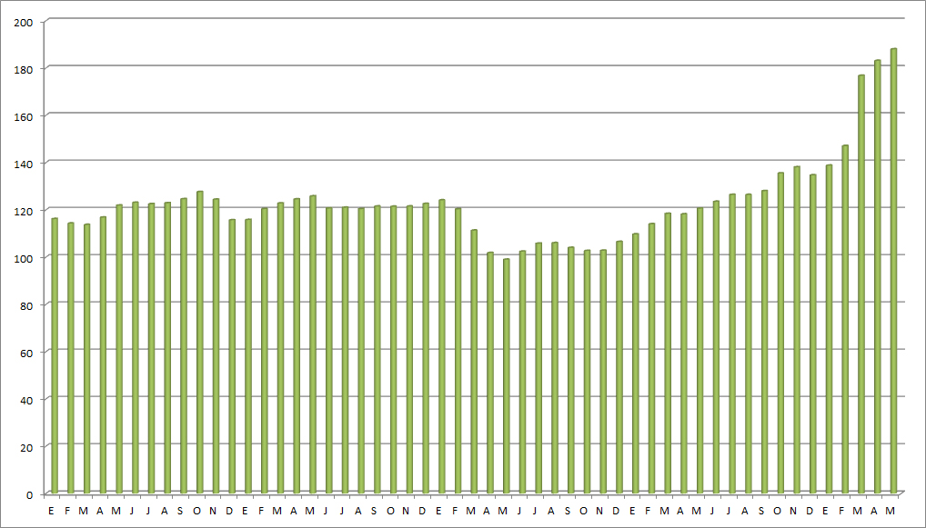 Observando el gráfico adjunto, correspondiente a los últimos cuatro años, observamos que el del mes de mayo de 2022 bate ampliamente el récord de todo el periodo, superando el anterior, que era del mes de abril de este mismo año. En la evolución de los cuatro años mencionados, es apreciable la bajada de los precios del combustible diésel que se produjo coincidiendo con el inicio de la pandemia, en la primavera de 2020, aunque a partir de que finalizara el estado de alarma, la subida volvió a ser la tónica general.
