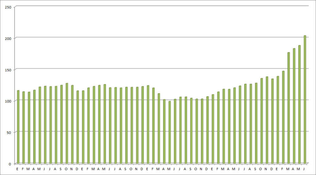 Observando el gráfico adjunto, correspondiente a los últimos cuatro años, observamos que el del mes de junio de 2022 bate ampliamente el récord de todo el periodo, superando el anterior, que era del mes de mayo de este mismo año. En la evolución de los cuatro años mencionados, es apreciable la bajada de los precios del combustible diésel que se produjo coincidiendo con el inicio de la pandemia, en la primavera de 2020, aunque a partir de que finalizara el estado de alarma, la subida volvió a ser la tónica general.