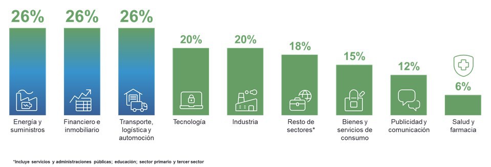 El general todos los segmenso muestran previsiones positivas en este respecto, aunque no todos al mismo nivel. Lo más optimistas junto a transporte y logística son los sectores financiero e inmoliario y de energía, que también cuentan con una estimación neta del 26%. Tras estos se encuentra industria y tecnología con un 20% cada uno, seguido por bienes y servicios de consumo (15%), y publicidad y comunicación (12%).