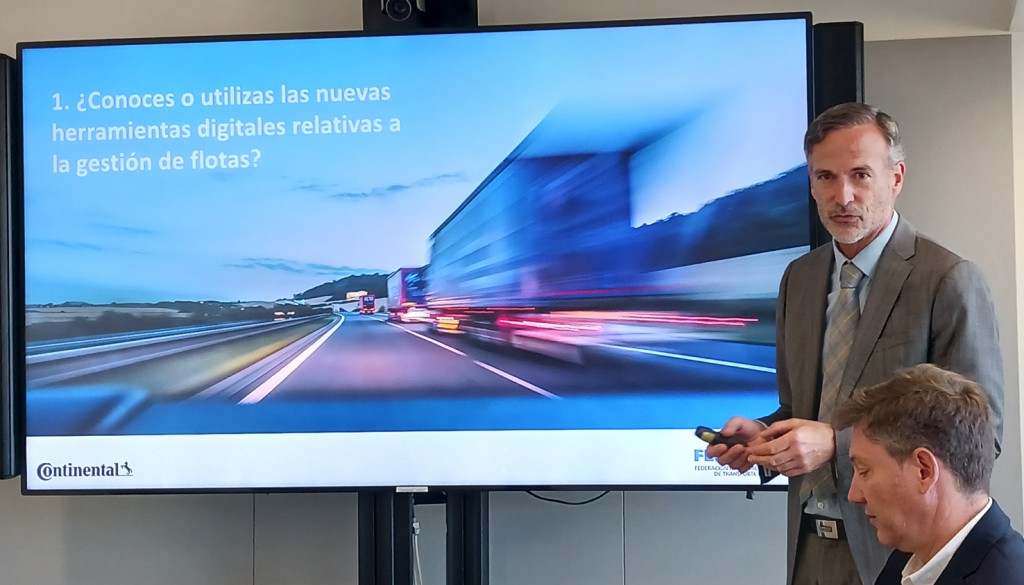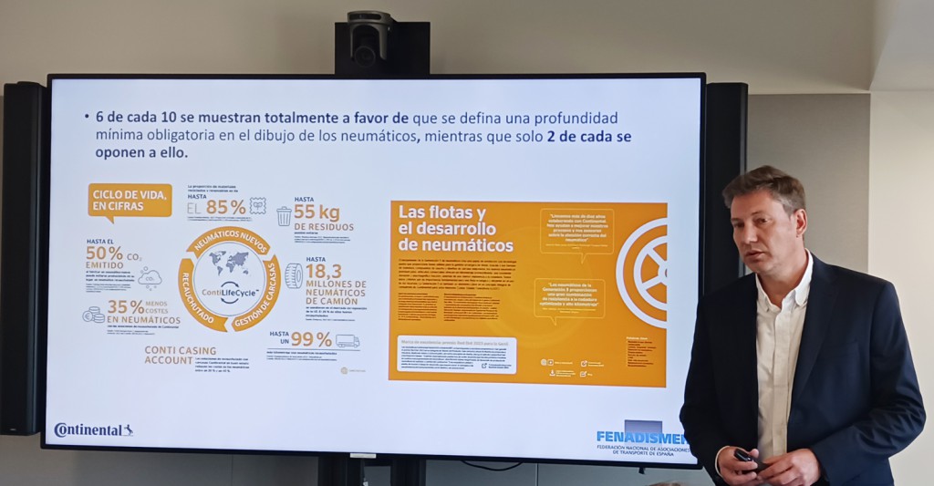 Antonio Sangüesa, responsable de soluciones y servicios a flotas de Continental, presentó el Libro Blanco sobre digitalización, sostenibilidad y conectividad que acaba de elaborar la compañía, apuntando sobre el estudio que “seis de cada 10 estarían a favor de una normativa de profundidad mínima del neumático, mientras que sólo dos se oponen. Cada milímetro de goma cuesta muchos euros, pero buscamos la máxima eficiencia con nuestro programa ContiLifeCicle. El coste de adquisición del neumático supone un 5-8% de la cuenta de explotación de una empresa, pero incide directamente sobre el consumo, la gestión de la flota, la operatividad, la disponibilidad…”.