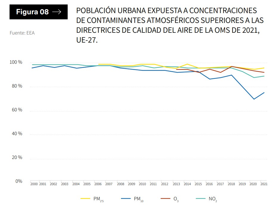 Según el informe Europes air quality status 2023, durante el 2021 el 97% de la población urbana estuvo expuesta a concentraciones de partículas finas (PM2.5) por encima del nivel de referencia basado en la salud establecido por la OMS en 2021 de 5 µg/m3 y el 90% de la población urbana expuesta a concentraciones de NO2 por encima del valor de referencia de la OMS.