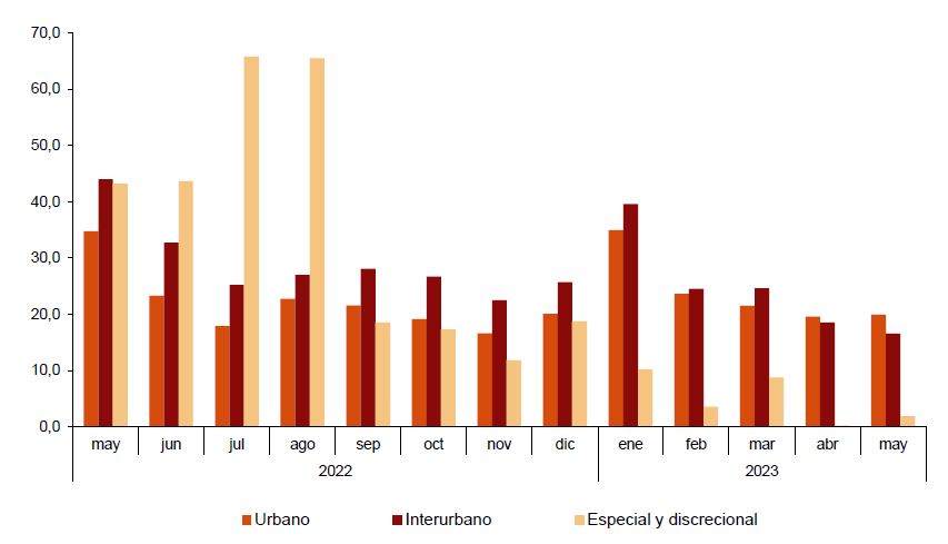 Por último, más de 53 millones de usuarios se decantaron por el transporte especial y discrecional en mayo (más de 10 millones por encima de la del mes previo), lo que se traduce en un crecimiento del +1,9% en la tasa anual (el dato previo era 0,2%). El número de pasajeros del transporte especial baja un -4,2%, por encima de los 33 millones. Dentro de dicho segmento, el escolar pierde un -3,1%, mientras que al laboral aún le fue peor: -8,3%. Finalmente, el transporte discrecional ha crecido un 13,6% respecto al mismo mes del año 2022, superando con amplitud los 21 millones de viajeros.