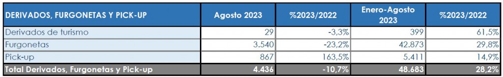 El acumulado de los ocho primeros meses del año indica que este subsegmento crece al +28,2% (importante caída de 15 puntos respecto a junio), con los derivados manteniendo sus crifras (+61,5), las furgonetas rozando las 43.000 unidades (+29,8%, pero perdiendo 23 puntos en el periodo estival) y los pick-ups recuperando el positivo: +14,9%.