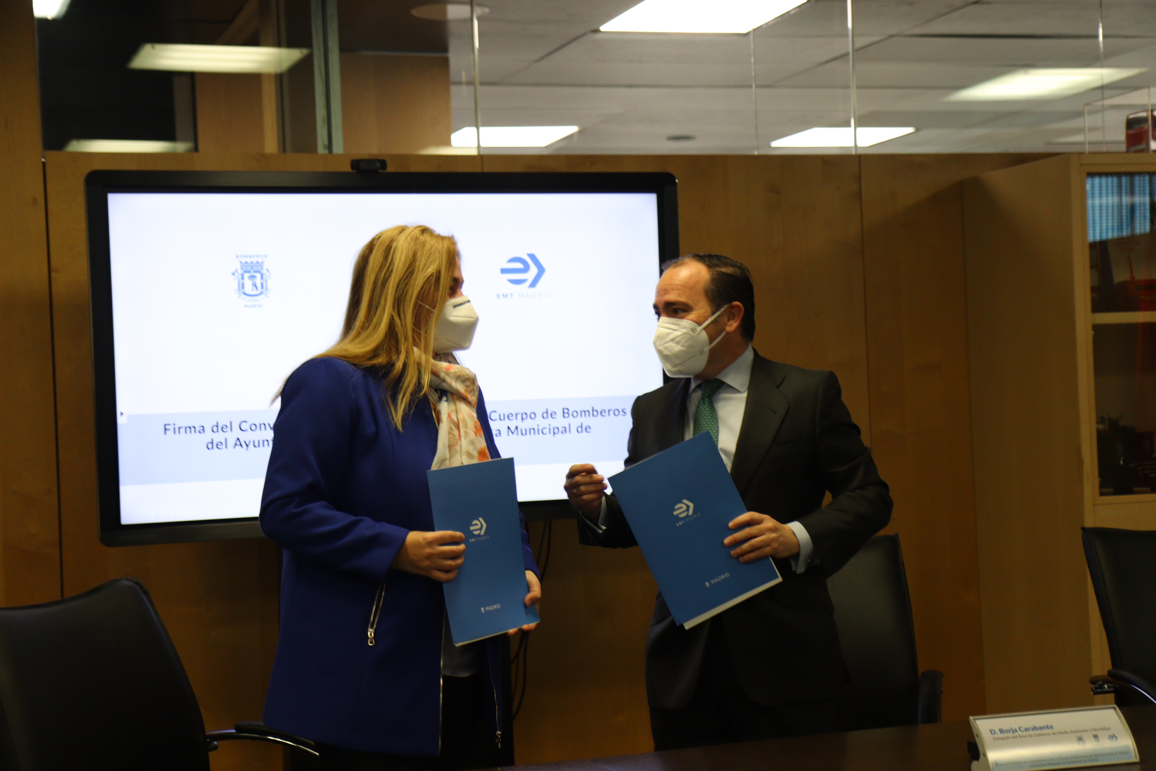 Inmaculada Sanz, delegada de Seguridad y Emergencias y portavoz municipal y Borja Carabante, delegado de Medio Ambiente y Movilidad ha conluido la firma de un convenio de colaboración por el que Bomberos de Madrid y la Empresa Municipal de Transportes (EMT) se comprometen a fomentar la colaboración, coordinación y cooperación ante situaciones de emergencia.