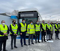 El consejero de Transportes e Infraestructuras también ha visitado la hidrolinera instalada por la empresa Alsa en la campa de Torrejón de Ardoz, compuesta por unos 18 bloques formados por 28 botellas de 50 litros cada uno, lo que suma una capacidad total de 25.200 litros de hidrógeno en estado gaseoso.