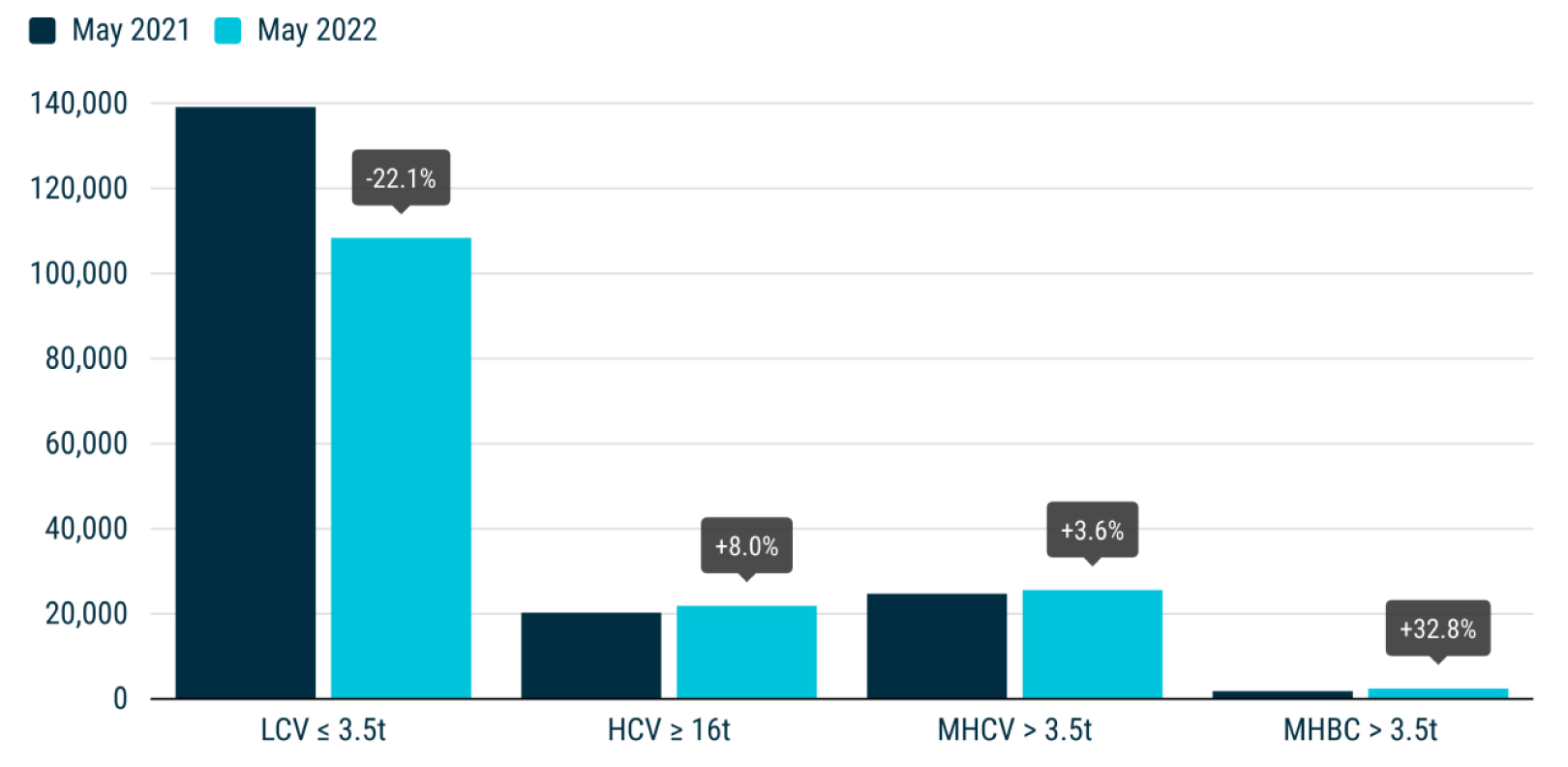 Durante los cinco primeros meses del año, las matriculaciones de comerciales ligeros nuevos cayeron un -23,2% en la Unión Europea, con un total de 538.444 unidades. Todos los principales mercados de la región registraron descensos, siendo España el que registró la caída más pronunciada (-36,1%). En toda la UE, solo Chipre, Eslovaquia y Letonia terminaron en positivo este periodo.