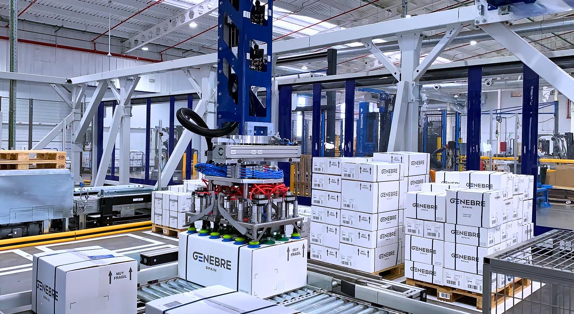 El nuevo sistema de automatización de Genebre incluye un robot cartesiano de TGW Logistics diseñado para la preparación de pedidos de clientes, que puede trabajar con hasta cinco tipos de cajas de diferentes tamaños y 25 kilogramos de peso. Su funcionamiento permite realizar hasta 170 ciclos (mecatrónicos) por hora y preparar hasta 29 europallets de forma simultánea. Además, el robot puede alimentar cada posición de preparación con un pallet vacío, para empezar un nuevo pedido de cliente.