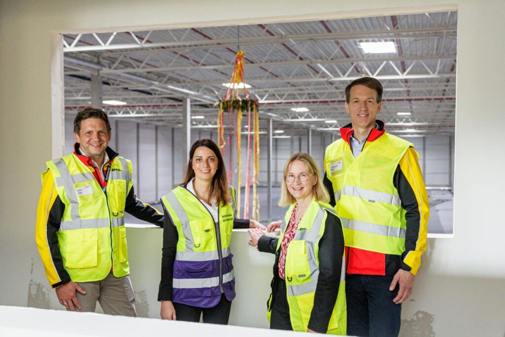 En la ceremonia de colocación de la cubierta para la construcción del nuevo centro logístico, se llevó a cabo hoy por DHL Supply Chain. Los protocolos de presentación del acto fueron realizados por Rainer Haag, consejero delegado, Aiste Slabokaite Heid, directora de la Unidad de Negocio Noreste, Olaf Müller, director del Campus de Leipzig/Halle y Adriano Rizza, director de Construcción, todos ellos de DHL Supply Chain Alemania & Alpes. También estuvieron presentes la Dra. Judith Marquardt, teniente de alcalde de Cultura y Deporte de la Ciudad de Halle (Saale), y diversos representantes del mundo empresarial y político.