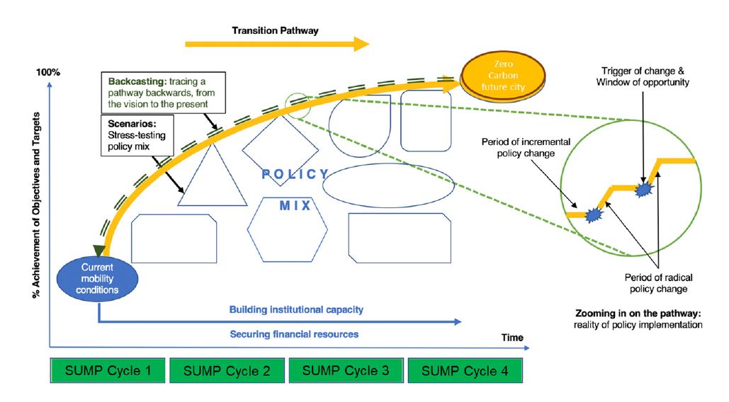 El desarrollo inicial de una estrategia de transición a largo plazo alimenta el inicio de un ciclo PMUS, durante el cual las estrategias de alto nivel se convierten en combinaciones de políticas específicas que impulsan la selección de medidas reales (por ejemplo, una estrategia para reducir el uso del coche en un 10% se traduce en mejoras específicas de los desplazamientos activos y el transporte público, y políticas de restricción del tráfico, como restricciones de aparcamiento).