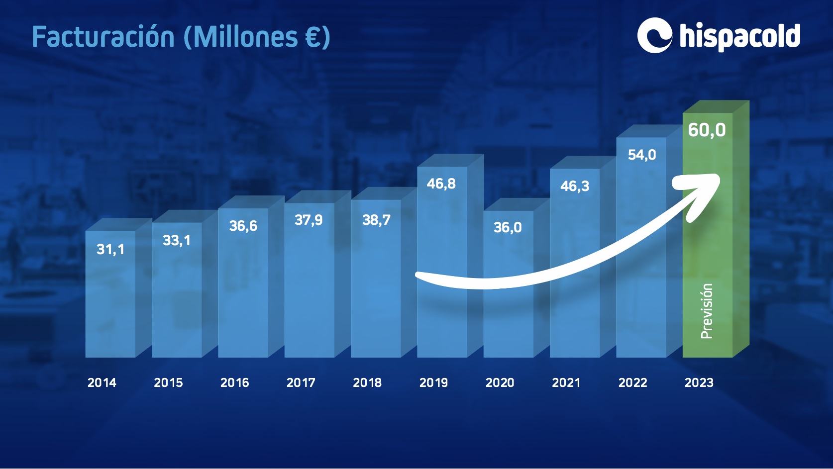 Los resultados de Hispacold se recuperaron en 2022 del efecto de la pandemia y continuaron con su crecimiento. La compañía incrementó su facturación en un 16,6% con respecto a 2021, alcanzando unos 54 millones de euros que suponen la mejor marca de su historia, resultado que atribuyen al crecimiento experimentado en el sector de electromovilidad y a los buenos números del mercado ferroviario.