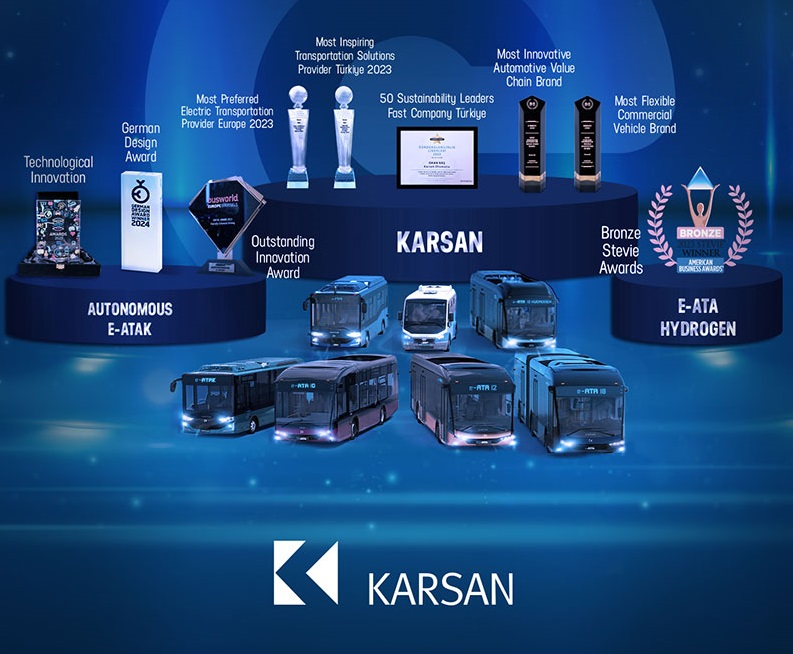 Karsan Autonomous e-Atak ha recibido el prestigioso premio «Excellent Product Design» del Consejo Alemán de Diseño. El CEO de Karsan, Okan Baş, destacó que el e-Atak autónomo se ha convertido en el líder en el sector del transporte público. Además, el vehículo ha sido reconocido en los Busworld Digital Awards como el modelo más admirado en la categoría de Conducción Mejorada Digitalmente. Este reconocimiento refuerza la capacidad de producción innovadora y de alta tecnología de Karsan.