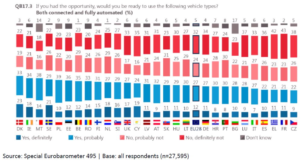Cuando se examinan dichas actitudes por países, la predisposición hacia los vehículos autónomos y conectados es muy dispar. Por lo que respecta a la preparación para utilizar vehículos totalmente automatizados y conectados, la mayoría de los encuestados a nivel de la UE dijeron que no estarían preparados para utilizar vehículos conectados (50% de los encuestados) o vehículos autónomos (53%), o tanto vehículos autónomos como conectados (56%). Los hombres eran significativamente más propensos que las mujeres a decir que estarían preparados para utilizar vehículos conectados (53% frente a 37%) y vehículos totalmente automatizados (52% frente a 34%). Del mismo modo, los encuestados más jóvenes (de 15 a 24 años) eran mucho más propensos a apoyar los vehículos conectados (64% frente a 30%) y los vehículos autónomos (61% frente a 28%) que los encuestados de más edad (55 años o más). Los que viven en zonas urbanas son más propensos a apoyar los vehículos conectados (46% frente a 40%) y los vehículos autónomos (48% frente a 39%) que los que viven en zonas rurales.