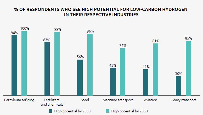 Las organizaciones esperan que las distintas aplicaciones maduren a ritmos diferentes, y se necesitarán modelos de negocio innovadores. Un vicepresidente ejecutivo de una empresa siderúrgica con sede en la India, afirma que «el mayor uso del hidrógeno bajo en carbono en la industria siderúrgica será la fabricación de DRI (reducción directa de las emisiones de dióxido de carbono) a base de hidrógeno, seguido del uso en altos hornos».