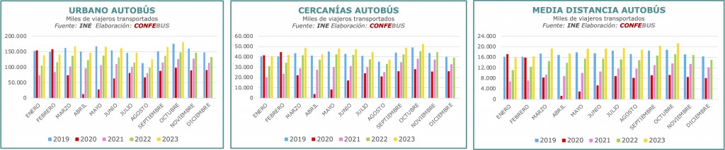 Por otro lado, la demanda en el período de enero a octubre de 2023 en el transporte de larga distancia está un -1,96% por debajo de la demanda en 2019, mientras que el transporte discrecional registra una caída del -16,42%.También se observa que el transporte escolar y el transporte laboral siguen por debajo de la demanda en 2019, con disminuciones del -10,7% y -7% respectivamente. En cuanto al autobús, la media de pasajeros de junio a octubre ha superado los niveles previos a la pandemia, con un incremento del 2,82% en comparación con la media de los mismos meses en 2019.