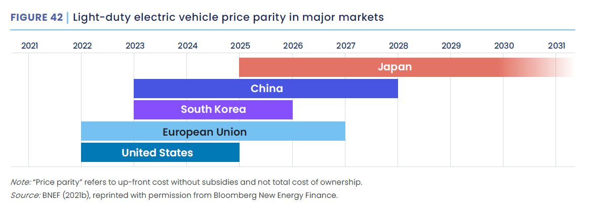 El coste total de poseer un coche eléctrico se está acercando rápidamente a la paridad con sus homólogos de países europeos, aunque este punto llegará más tarde en los países en desarrollo. El coste total de la propiedad de los camiones urbanos o regionales de emisiones cero se acerca a la paridad en China, Europa y Estados Unidos (con la India no muy lejos), aunque los camiones de largo recorrido alcanzarán la paridad mucho más cerca de 2050.