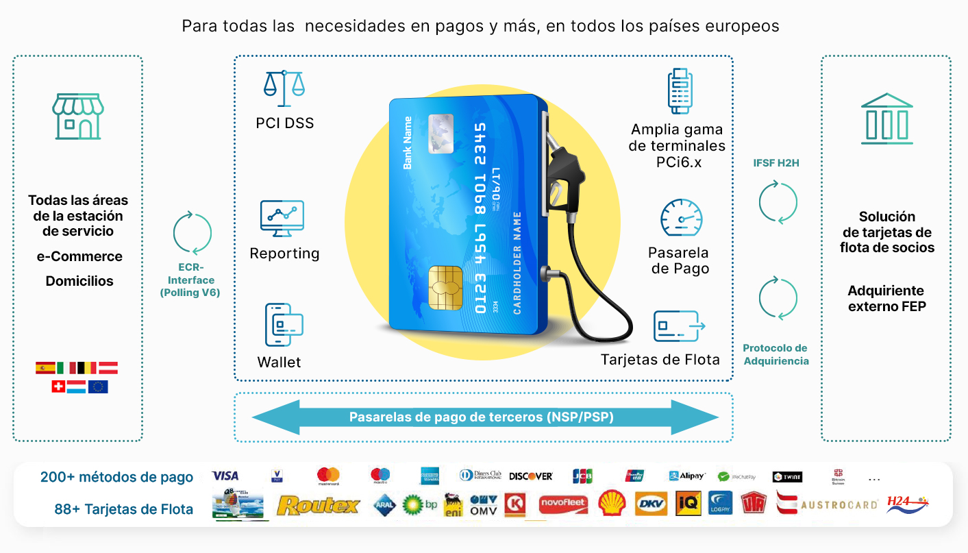 El ecosistema de esta solución integral incluye tarjetas universales, tipo Visa, tarjetas profesionales privadas, programas de fidelización, Cashback, tarjeta de crédito y prepago privadas, pago móvil y eMoney y conversión dinámica de divisas. Ahora integra una plataforma de digitalización para las estaciones de servicios: ‘Pay&Drive wallet’, que hace posible ofrecer a los conductores una experiencia de pago digital en cualquiera de las áreas de la estación de servicio.