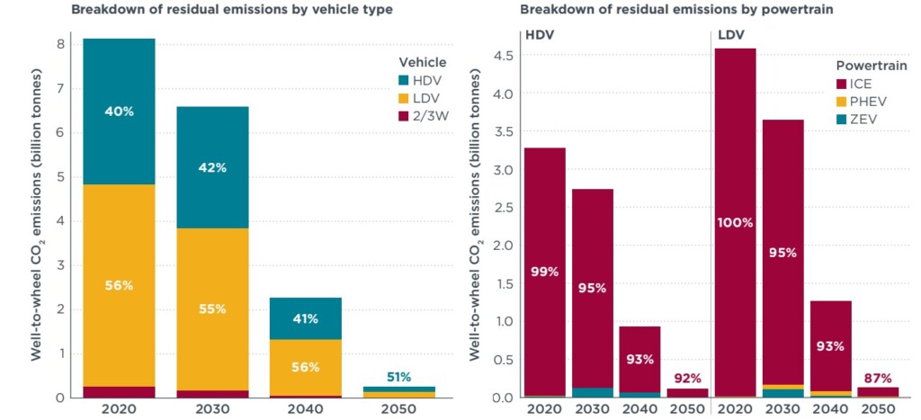 En el escenario ‘All Out’, los vehículos ligeros son la principal fuente de emisiones residuales. Hasta 2050, la contribución de los vehículos ligeros y pesados a las emisiones residuales se mantiene prácticamente constante. Los vehículos convencionales de combustión interna y los vehículos eléctricos híbridos enchufables (PHEV) siguen siendo responsables de una gran parte de las emisiones de los vehículos ligeros. En 2050, cualquier emisión restante relacionada con los VEZ proviene de la combustión de hidrógeno, ya que la generación de electricidad es neta cero en todas las regiones en All Out.