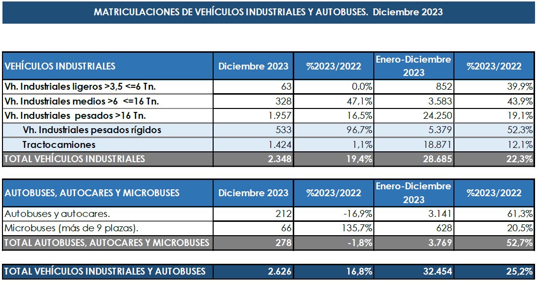 En cuanto a los vehículos Industriales, el último dato mensual también fue favorable, con un total de 2.348 unidades (600 menos que en noviembre) que significan una subida del +19,4% respecto a diciembre de 2022. Así, el acumulado anual se sitúa en 26.685 vehículos, subiendo un +22,3% (dato casi parejo respecto al mes precedente).