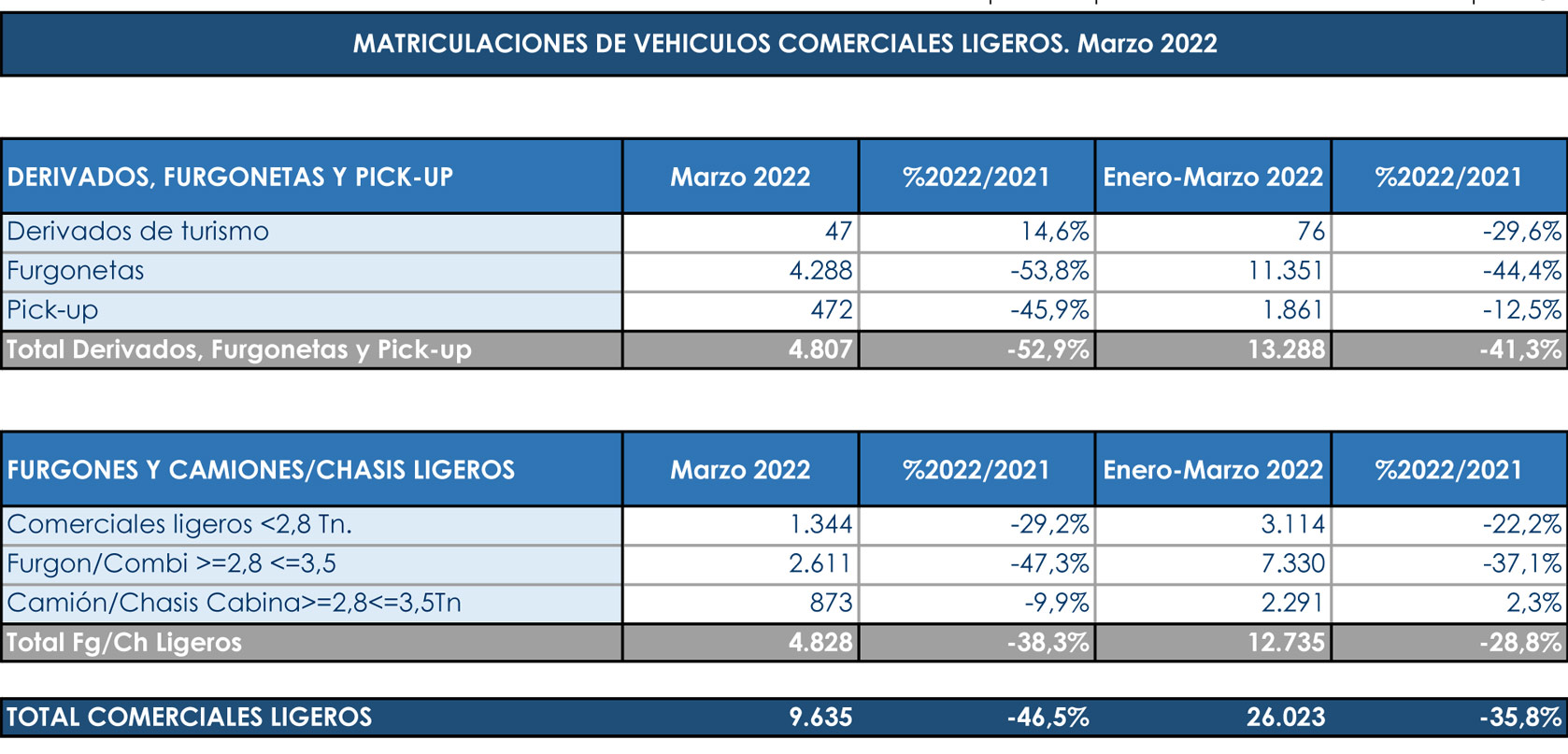 Esto se traduce en un acumulado anual, de los tres primeros meses del año, del -35,8% (26.023 unidades), con especial incidencia a la baja de los comerciales más ligeros (-52,9%), al igual que sucedió en febrero.