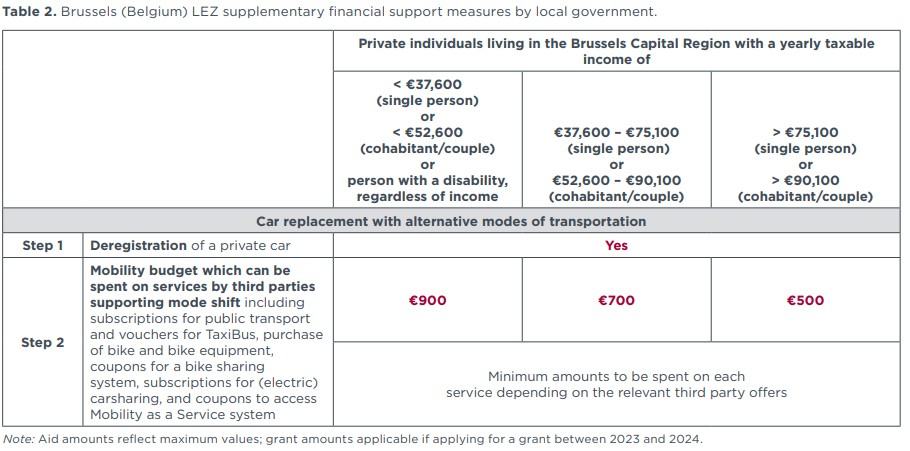 En marzo de 2022, Bruselas relanzó su Prima Bruxell’Air, un presupuesto de movilidad para que los residentes den de baja los coches en favor de modos de transporte alternativos creado en 2006 para mejorar la calidad del aire local. Los importes de las primas se ajustaron como parte del relanzamiento y se añadió un componente de equidad social, diferenciando los importes de las primas en función de los ingresos familiares y el estado de discapacidad.