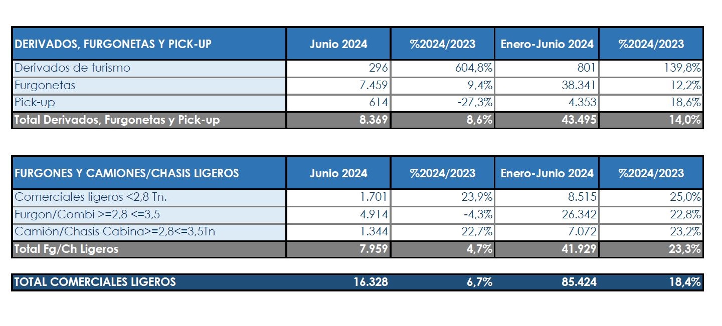 Por lo que respecta a los Comerciales de mayor tonelaje, se matricularon en junio 7.959 vehículos sumando los comerciales por debajo de 2,8 toneladas, furgones/combi entre 2,8 y 3,5 toneladas, y chasis/cabina, un +23,3% respecto al mismo mes del año anterior.