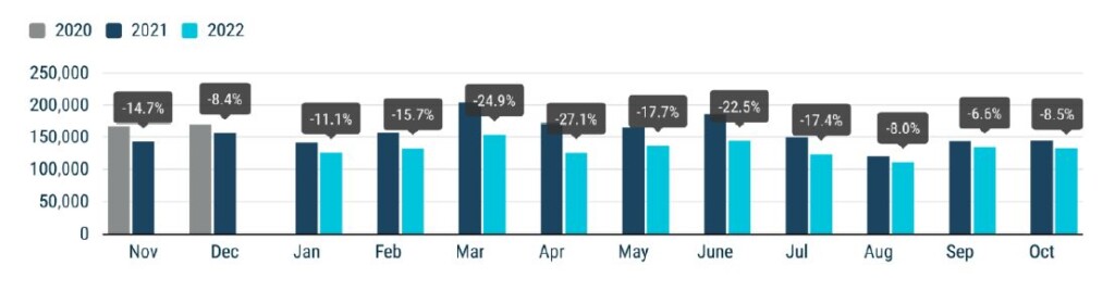 Durante los 10 primeros meses de 2022, las ventas de vehículos en la UE se mantuvieron en terreno negativo (-16,8%), con un total de casi 1,3 millones de unidades. Los cuatro mayores mercados de la región registraron resultados negativos, con España de nuevo registrando el mayor descenso (-20,9%).