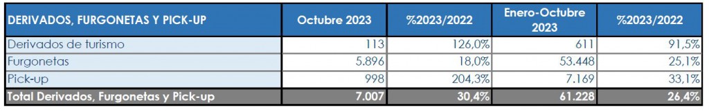 El acumulado de los 10 primeros meses del año indica que este subsegmento crece al +26,4% (medio punto más respecto a septiembre), con los derivados mejorando sus cifras (+91,5), las furgonetas rozando las 53.500 unidades (+25,1%, pero perdiendo casi un punto) y los pick-ups consolidando el positivo recuperado tras el verano: +33,1%.