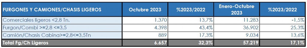 Así, el acumulado anual de este segmento tras los primeros 10 meses se sitúa en un +17,1%, recuperando casi dos puntos (57.219 unidades), con los chasis/cabina creciendo un +13,6%, al igual que los furgones/combi entre 2,8 y 3,5 toneladas (+25,3%), mientras que los comerciales hasta 2,8 toneladas están a punto de abandonar la zona roja (-1,5%).