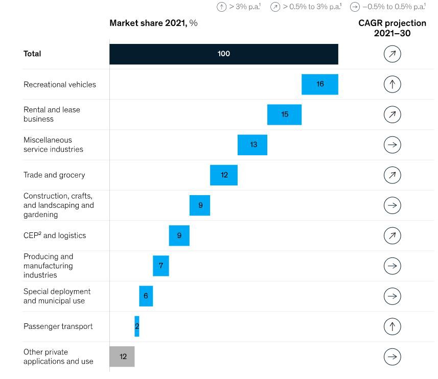 Después de los vehículos industriales recreativos y el transporte de pasajeros, los segmentos de mayor crecimiento son el comercio y la alimentación y los segmentos de mensajería, correo urgente y paquetería (CEP) y logística. En los últimos años, ambos han experimentado un fuerte crecimiento, que se espera continúe más allá de la línea de base establecida. En el segmento del comercio, la cuota de los comestibles sigue siendo bastante pequeña; por ejemplo, en Alemania es sólo del 22%.
