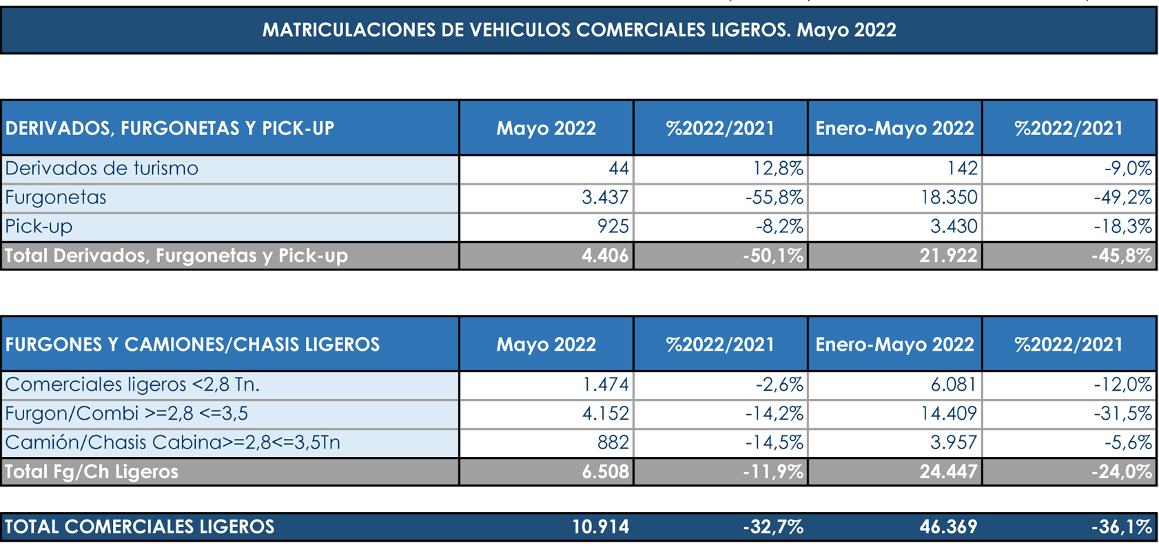 En el acumulado, esta bajada de mayo se suma a la vivida los meses precedentes, por lo que el conjunto del segmento de los comerciales más ligeros pierde un 45,8% (1,2 puntos más), con un total de 21.992 unidades.