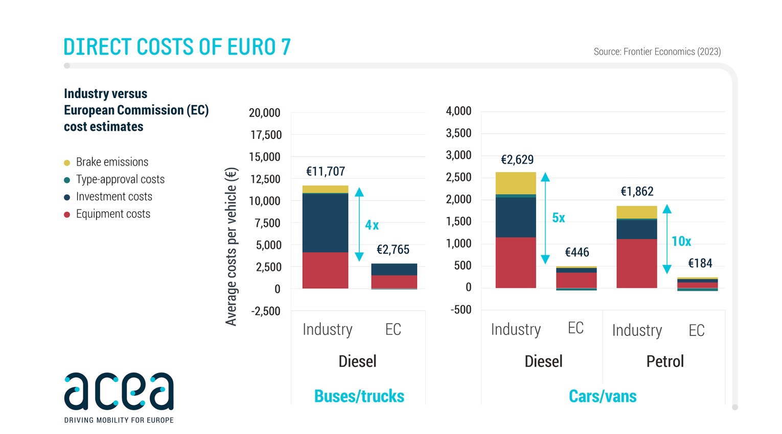 La Comisión Europea había estimado que el Euro 7 supondría aumento de entre 180 y 450 euros en la fabricación de coches y furgonetas y de 2.800 euros para camiones y autobuses, pero estas predicciones podrían haber sido demasiado optimistas. Un reciente estudio llevado a cabo por Frontier Economics afirma que dicho impacto podría ser entre cuatro y diez mayor, situando el crecimiento de los costes de fabricación de coches y furgonetas en los 2.000 euros y el de camiones y autobuses en los 12.000.
