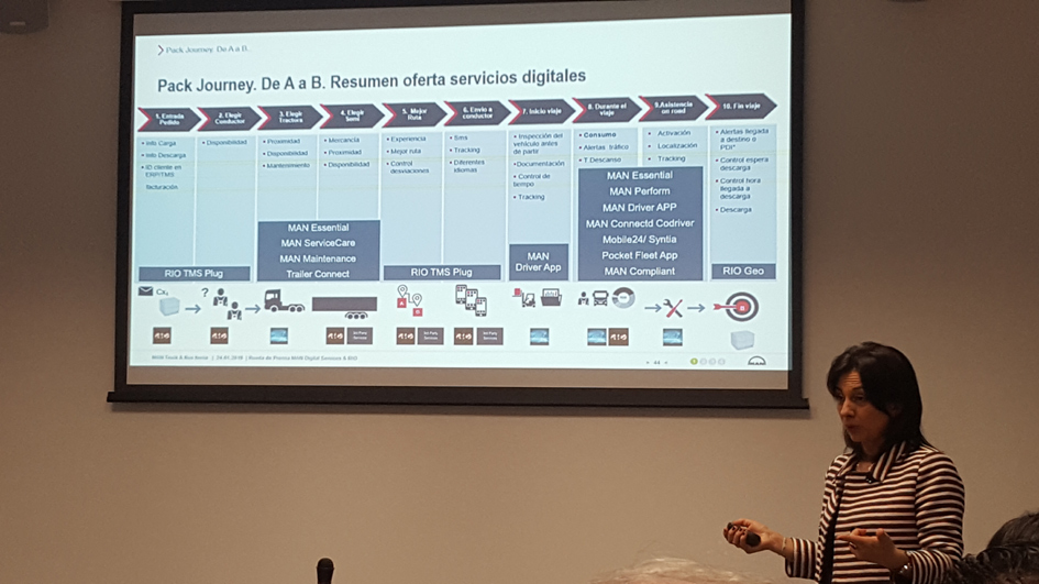 MAN ha diseñado todo el viaje de un paquete desde que se recibe el pedido hasta que se entrega y se factura. Son muchos los pasos que se incluyen, y para cada uno de ellos está disponible un paquete específico, con múltiples aplicaciones. En la actualidad, ya están circulando por Europa 60.000 camiones con RIO activado (en el futuro se desarrollarán servicios específicos para furgonetas y autobuses), de los cuales 814 están en España, pertenecientes a 380 clientes. En nuestra próxima edición de NEXOTRANS encontrarán un amplio artículo explicando todas las funcionalidades de MAN Digital Services.