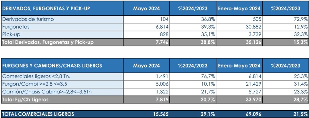 La información aportada por Anfac, Faconauto y Ganvam refleja que los Comerciales crecieron un +29,1% respecto al mismo mes de 2023 (aunque lejos del 47% del mes anterior), para un total de 15.565 unidades matriculadas (casi las mismas que en abril. El acumulado de los cinco primeros meses se sitúa en +21,5% (dos puntos más que en marzo), superando ligeramente las 69.000 unidades.