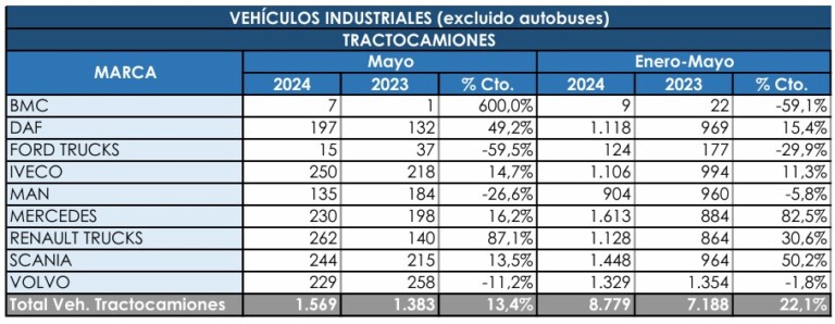 Las matriculaciones de tractoras confirmaron el pasado mes de mayo su buen comienzo de ejercicio, al crecer un +13,4% (para un total de 1.569 unidades),