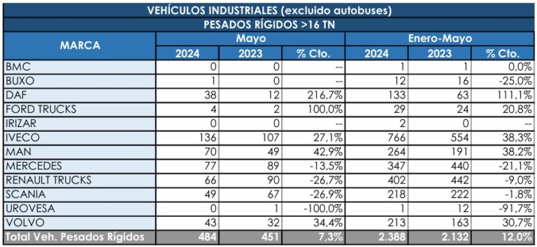 Las matriculaciones de vehículos rígidos de más de 16 toneladas registraron el pasado mes de mayo un incremento del +7,3% (hasta un total de 484