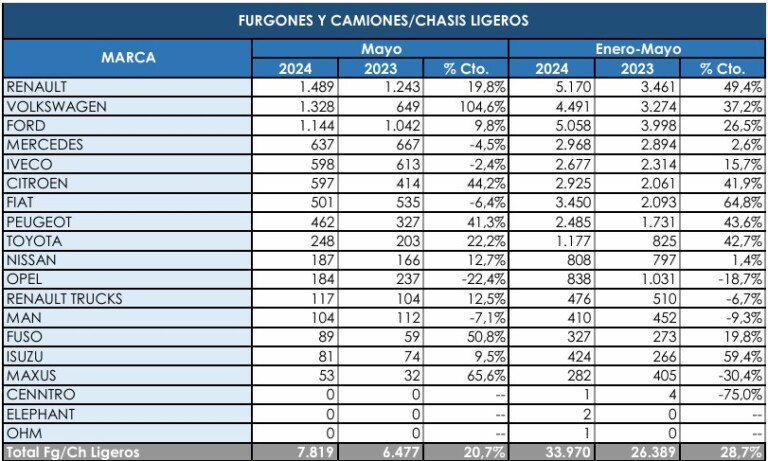 El mercado español creció un +38,8% en la venta de los vehículos comerciales más ligeros durante el pasado mes de mayo, con un total de